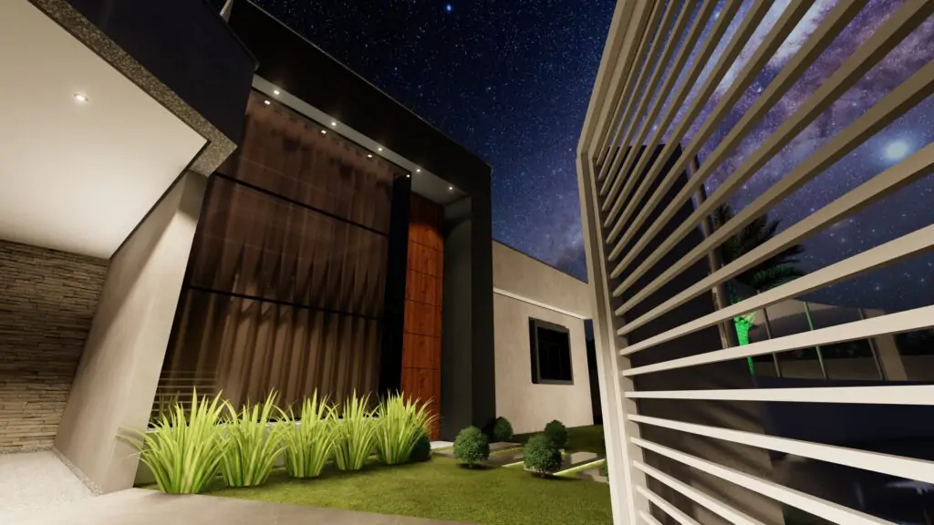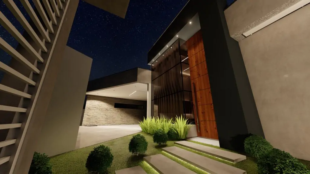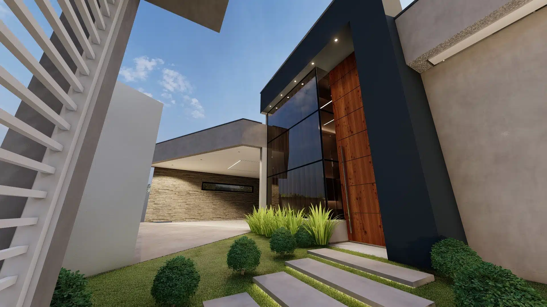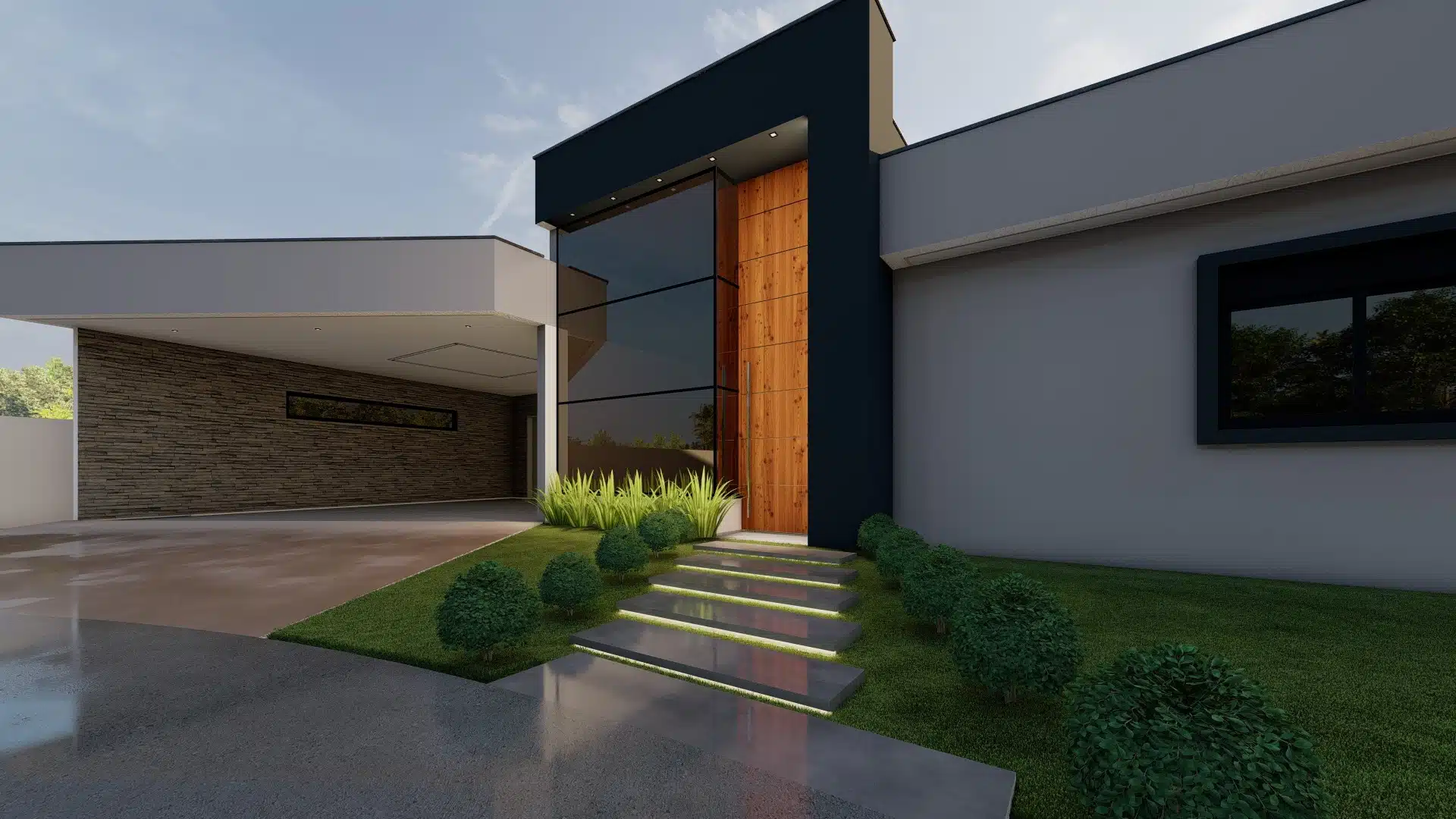 Projeto único com um detalhe desafiador para a execução quando mencionamos a garagem que não é apenas um ambiente da residência, mas sim um importante detalhe arquitetônico na fachada. Contando com mais de vinte metros em sua dimensão frontal de terreno o projeto foi pensado não carregar de muitas informações a fachada e seguir um norte sem curvas, limpo e moderno.